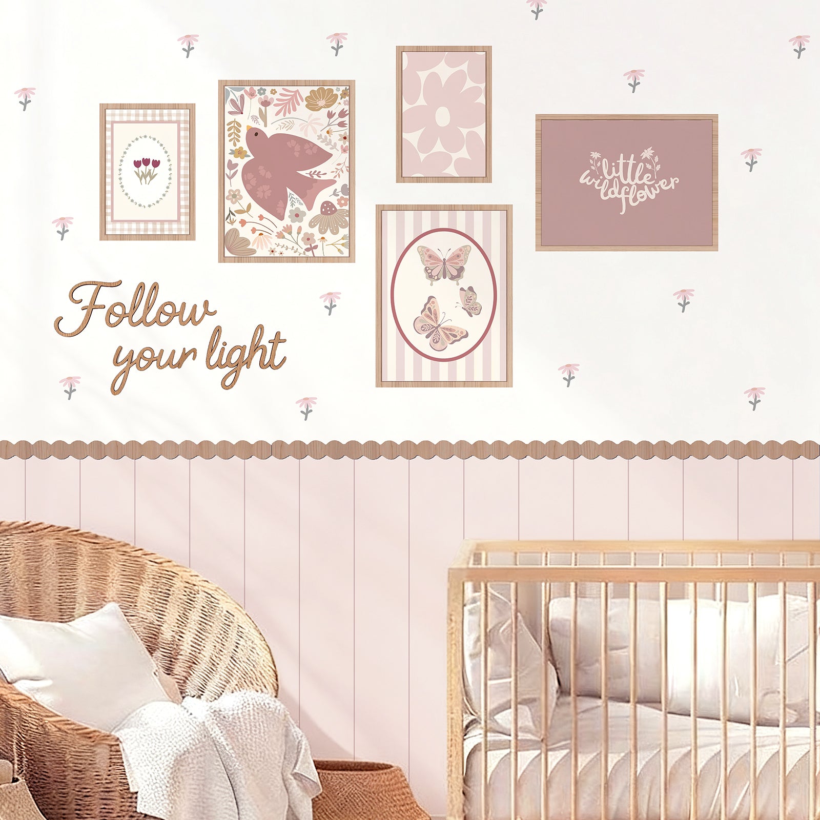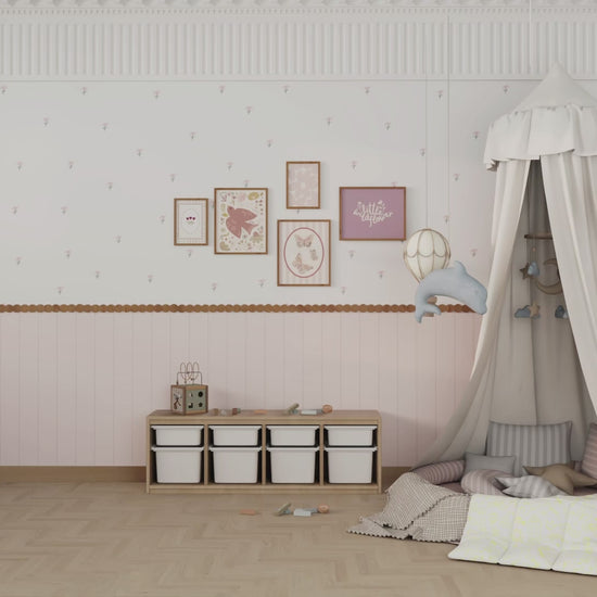 Create a clean, built-in “panel wall” effect in minutes. This set combines blush wainscoting-style panels, a scalloped trim border, and delicate floral accents for a cozy, designer finish—no paint, no nails, no mess.