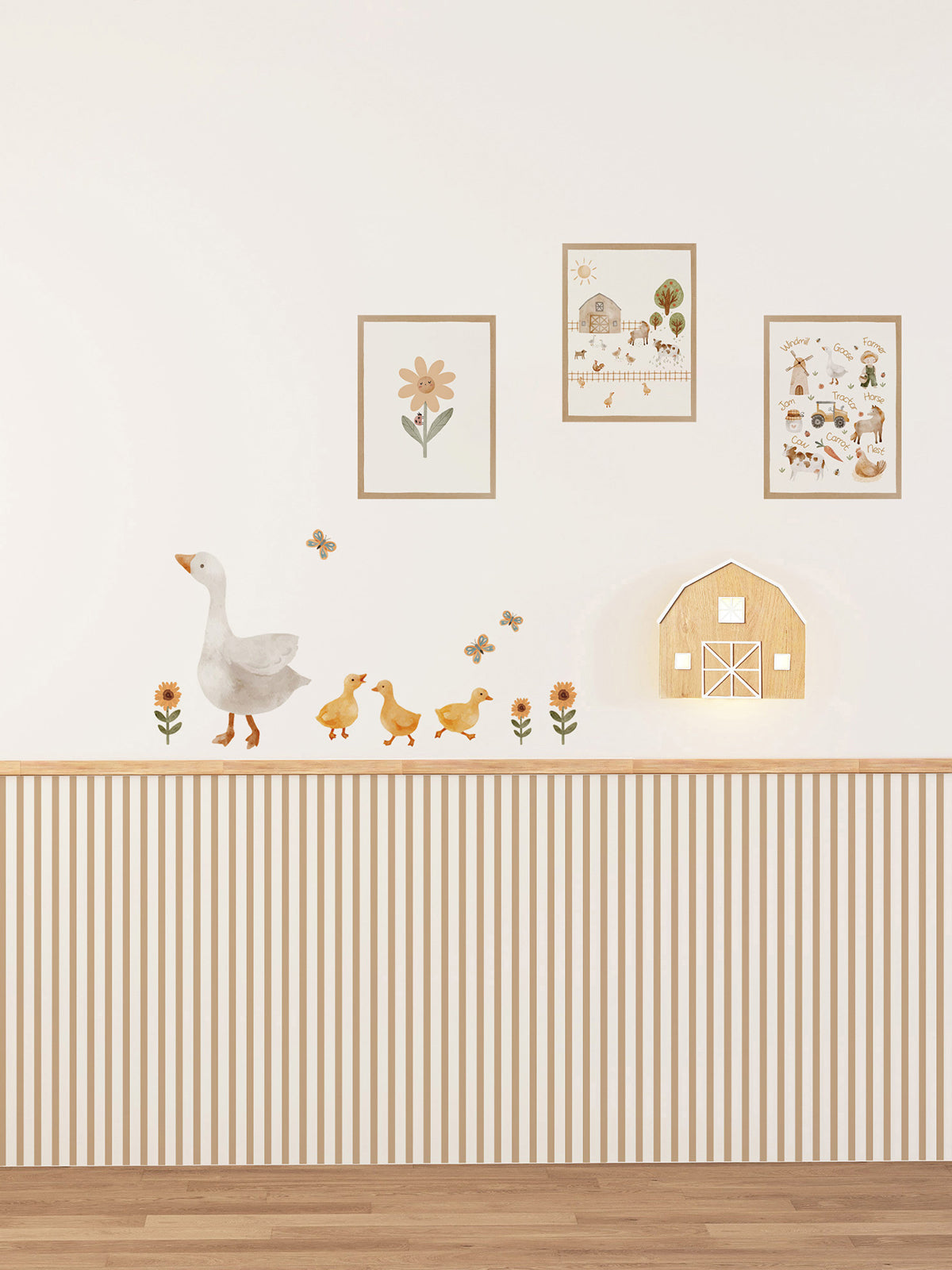 Turn a plain wall into a cozy farmhouse scene for your children’s room. This full set combines top wall decals (goose, ducklings, butterflies, and flowers) with bottom striped wall panels to create a beautiful “wainscoting” look—plus a matching wooden barn board with a light for an extra warm, bedtime-friendly glow. Ideal for nurseries, playrooms, and reading corners, and designed to make decorating easy without paint or complicated tools.